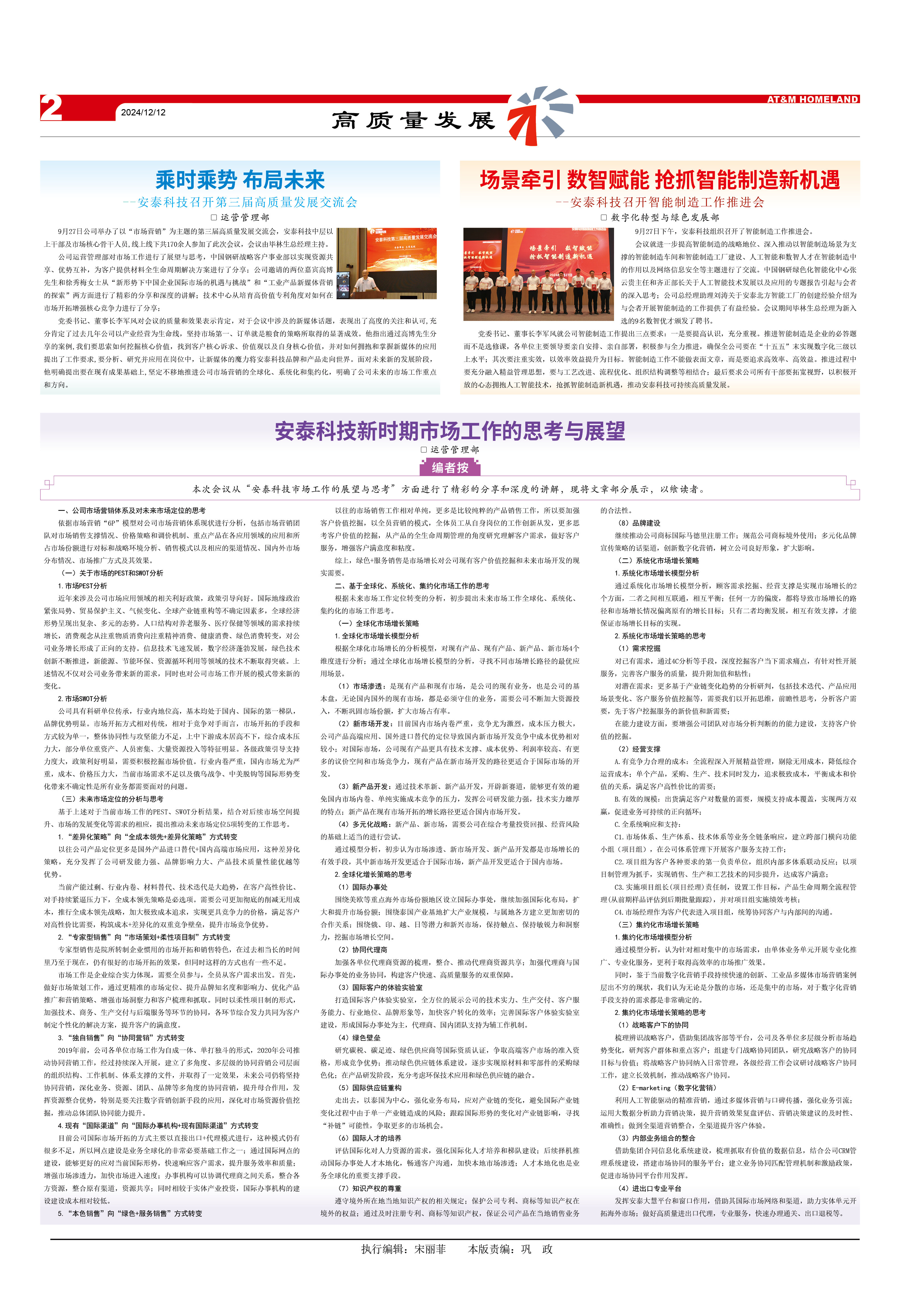 黨委書記、董事長李軍風(fēng)對會議的質(zhì)量和效果表示肯定,對于會議中涉及的新媒體話題,表現(xiàn)出了高度的關(guān)注和認(rèn)可,充分肯定了過去幾年公司以產(chǎn)業(yè)經(jīng)營為生命線,堅(jiān)持市場第一、訂單就是糧食的策略所取得的顯著成效。他指出通過高博先生分享的案例,我們要思索如何挖掘核心價(jià)值,我到客戶核心訴求、價(jià)值觀以及自身核心價(jià)值,并對如何擁抱和掌握新媒體的應(yīng)用提出了工作要求,要分析、研究并應(yīng)用在崗位中,讓新媒體的魔力將安泰科技品牌和產(chǎn)品走向世界。面對未來新的發(fā)展階段,他明確提出要在現(xiàn)有成果基礎(chǔ)上,堅(jiān)定不移地推進(jìn)公司市場營銷的全球化、系統(tǒng)化和集約化,明確了公司未來的市場工作重點(diǎn)和方向。